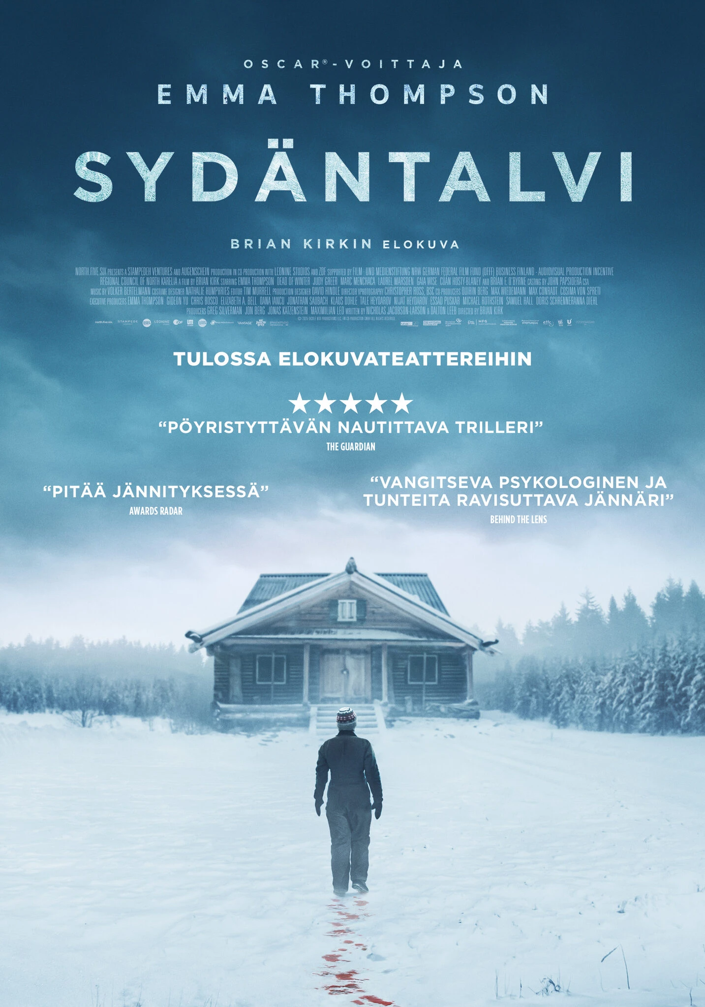 Suomen Kolilla kuvattu Sydäntalvi on draamatrilleri, jonka pääosissa nähdään kaksinkertainen Oscar-voittaja Emma Thompson. Hän esittää leskeksi jäänyttä kalastajaa, joka löytää syrjäiseltä metsämökiltä kidnapatun teinitytön. Lähimpään kaupunkiin on tuntien matka ja puhelinyhteys on poikki – hän ymmärtää olevansa tytön ainoa toivo. Mutta kun lumimyrsky yltyy ja vaarallinen pariskunta lähestyy, alkaa armoton taistelu selviytymisestä.